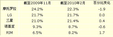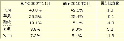 以下為各大智能手機平臺截至2009年11月的三個月平均市場份額與截至2010年2月的三個月平均市場份額對比: