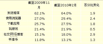 以下為各類移動內容截至2009年11月的三個月平均使用比例與截至2010年2月的三個月平均使用比例對比: