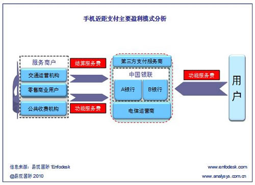 根據(jù)Enfodesk易觀智庫(kù)近期發(fā)布的《中國(guó)手機(jī)支付市場(chǎng)系列專(zhuān)題報(bào)告2010——近距支付》報(bào)告顯示,手機(jī)近距支付的主要盈利模式只有三種:即前向用戶(hù)服務(wù)費(fèi)、結(jié)算手續(xù)費(fèi)和后向商戶(hù)服務(wù)費(fèi)。
