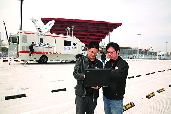 中國電信的應(yīng)急衛(wèi)星通信車抵達中國館,為世博會開幕護航。