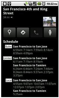在公共交通地點(diǎn)頁面中還能看到新版的時(shí)刻表,你可以點(diǎn)擊地圖上的任何一個(gè)中轉(zhuǎn)站點(diǎn)的圖標(biāo)來打開一個(gè)新的頁面查看未來車次的發(fā)車時(shí)間,這樣可以更好的安排自己的行程,這項(xiàng)功能支持任何提供有在線時(shí)刻表的地鐵、巴士或者火車車站。