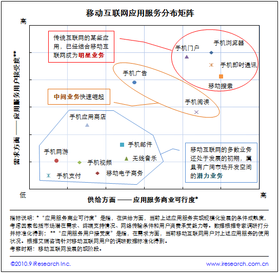 根據(jù)艾瑞咨詢近期發(fā)布的《2009-2010年中國移動互聯(lián)網(wǎng)行業(yè)發(fā)展報告》,移動互聯(lián)網(wǎng)各應用服務在“應用服務商業(yè)可行度”和“應用服務用戶接受度”兩個維度上被劃分為“明星業(yè)務”、“中間業(yè)務”和“潛力業(yè)務”三個類型。具備一定規(guī)模化發(fā)展市場條件,但還面臨若干限制因素的移動互聯(lián)網(wǎng)業(yè)務,將在未來逐步打開市場。