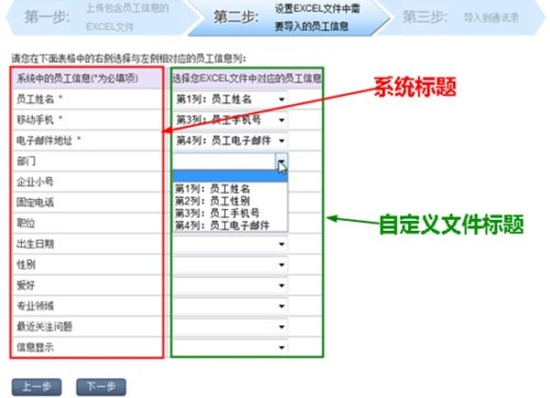 系統(tǒng)將自動(dòng)讀取上傳的文件標(biāo)題并在頁(yè)面右邊列表顯示上傳文件中的全部標(biāo)題名稱(即自定義文件標(biāo)題),通過與左邊系統(tǒng)標(biāo)題的對(duì)應(yīng)后,點(diǎn)擊“下一步”按鈕即可進(jìn)行第三步的操作。