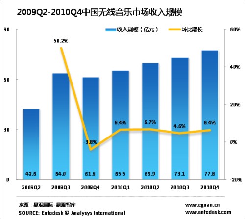 根據(jù)Enfodesk易觀智庫最新發(fā)布的數(shù)據(jù)顯示,2010年第4季度中國無線音樂收入保持穩(wěn)定的增長,達到74.13億元,環(huán)比增長4.58%。