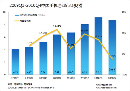 2010年Q4手機游戲市場規(guī)模8.77億首次出現(xiàn)負增長