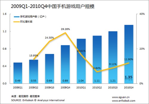 另外,從手機游戲用戶規(guī)模來看,2010年第4季度中國手機游戲用戶數量達到了1.35億,環(huán)比增長11.9%。
