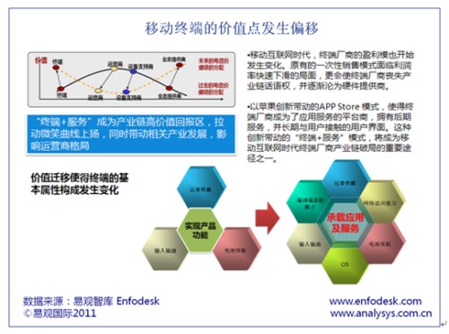 易觀智庫Enfodesk在近期發(fā)布《中國移動互聯(lián)網(wǎng)市場年度綜合報(bào)告2011》中認(rèn)為,隨著3G的普及以及多元化移動應(yīng)用的出現(xiàn),智能手機(jī)取代功能手機(jī)已成定勢,導(dǎo)致傳統(tǒng)的移動終端價(jià)值點(diǎn)開始由產(chǎn)品化向服務(wù)化遷移。終端廠商原有模式也受到極大挑戰(zhàn)。若不進(jìn)行有效轉(zhuǎn)型恐難以在未來2-3年后的手機(jī)市場生存。