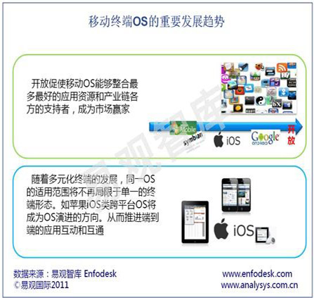 易觀國際(Analysys International)在近期發(fā)布易觀智庫Enfodesk《中國移動互聯網行業(yè)年度綜合報告2011》中對于移動終端OS部分進行了深入的研究。易觀國際認為,隨著3G和移動互聯網的迅猛發(fā)展,多樣化的移動應用體系逐漸形成,促使具有獨立OS的智能手機市場規(guī)模不斷擴大。移動終端OS作為用戶與終端進行交互的操作接口,以及移動應用、內容、服務運行的平臺,對于移動互聯網的發(fā)展起著至關重要的意義。未來在各種形態(tài)移動互聯網應用和服務爆發(fā)性增長的情況下,移動終端OS生態(tài)圈建設將走向開放,并促使多元化終端之間的互聯互通,成為終端發(fā)展的新機遇。