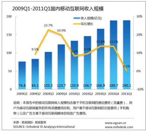 2011年第1季度國內(nèi)移動互聯(lián)網(wǎng)收入達190億元