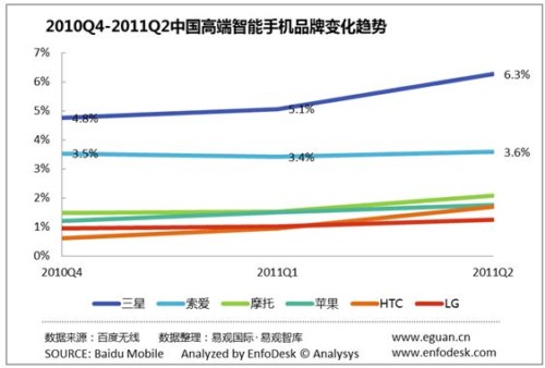 3、HTC、三星、摩托為代表的智能手機收益于Android得到快速發(fā)展。作為最早一批生產(chǎn)Android智能手機的廠商,HTC、三星、摩托羅拉等受益于Android的發(fā)展,PV份額保持增長。另外,第2季度HTC、三星、摩托基于Android的新機型上市也是PV占比增長的原因之一。