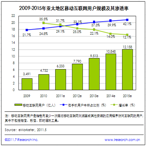 iResearch艾瑞咨詢整理eMarketer數(shù)據(jù)時(shí)發(fā)現(xiàn),2010年亞太地區(qū)移動(dòng)互聯(lián)網(wǎng)用戶規(guī)模達(dá)到4.732億,較2009年增長35.5%,占手機(jī)用戶總數(shù)的24.8%。預(yù)計(jì)2011年移動(dòng)互聯(lián)網(wǎng)用戶數(shù)將達(dá)6.233億,增幅為31.7%,占手機(jī)用戶總數(shù)的29.1%。在未來的5年里,亞太地區(qū)移動(dòng)互聯(lián)網(wǎng)用戶規(guī)模增速有所下降,但其在手機(jī)用戶總數(shù)中的比例將進(jìn)一步增加。