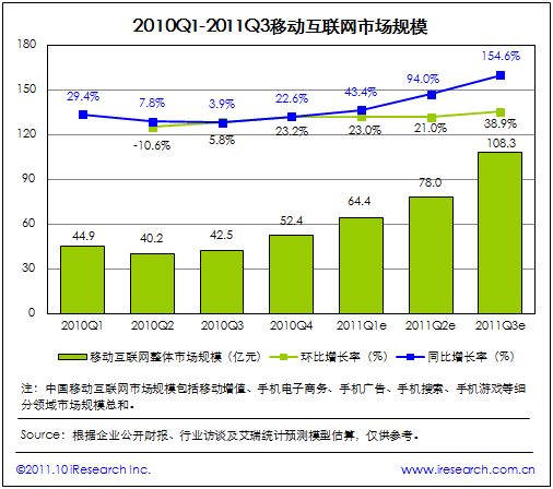 2011Q3中國移動(dòng)互聯(lián)網(wǎng)市場規(guī)模達(dá)108.3億元,爆發(fā)之勢初顯