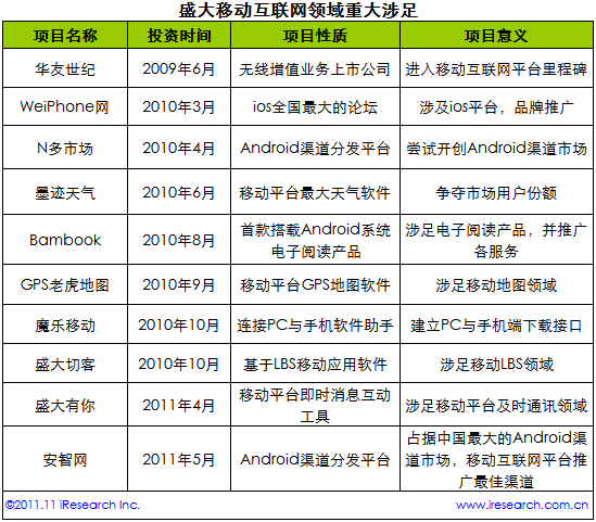根據(jù)艾瑞咨詢(xún)整理的數(shù)據(jù)認(rèn)為,盛大一向秉持這“產(chǎn)業(yè)布局比產(chǎn)品開(kāi)發(fā)更重要”的想法,縱觀盛大在幾年中對(duì)移動(dòng)互聯(lián)網(wǎng)的產(chǎn)業(yè)鏈建立,投資及開(kāi)發(fā)項(xiàng)目可謂是星光奪目。