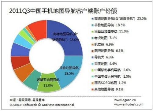 諾基亞:以11.0%的綜合份額列中國手機(jī)地圖導(dǎo)航客戶端市場排名季軍。據(jù)Q3財(cái)報(bào)顯示,諾基亞手機(jī)中國區(qū)的銷量為1590萬部,同比減25%,其全球智能手機(jī)出貨量下滑39%。諾基亞正在向WindowsPhone轉(zhuǎn)移,諾基亞全球地圖的數(shù)據(jù)(中國區(qū)除外)計(jì)劃提供給Bing地圖使用,然后內(nèi)置在WP中。未來,中國區(qū)諾基亞WP手機(jī)中Bing和Nokia品牌手機(jī)地圖客戶端的地位如何協(xié)調(diào),仍不明朗。