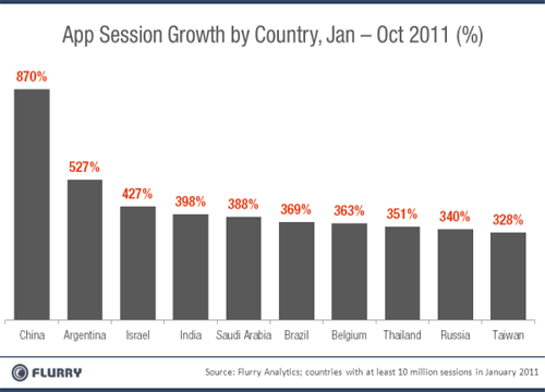 圖:2011年1至10月移動(dòng)應(yīng)用下載增速最快的十個(gè)國(guó)家