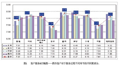 客戶服務MOT地圖(圖1)——該模塊通過對10086熱線服務過程的全景式展示,直觀表現不同地區(qū)、不同品牌客戶在10086熱線服務不同環(huán)節(jié)上的核心需求,話務員通過本模塊,可以迅速把握10086熱線服務的要點;