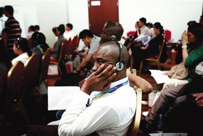 昨日,京交會(huì)上,“中國(guó)分銷服務(wù)業(yè)企業(yè)走出去”會(huì)場(chǎng),一位外籍嘉賓在認(rèn)真聽(tīng)同聲傳譯。新京報(bào)記者 孫純霞 攝