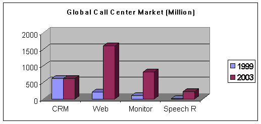 。。在1999年,全球呼叫中心應(yīng)用軟件的市場(chǎng)總值為29億美元,到2003年這一數(shù)字將增長(zhǎng)近三倍,達(dá)到85億美元。這一增長(zhǎng)主要來(lái)源于對(duì)基于互聯(lián)網(wǎng)呼叫應(yīng)用軟件以及呼叫監(jiān)控解決方案的需求。Data-monitor 市場(chǎng)分析專家在1999年針對(duì)呼叫中心軟件市場(chǎng)進(jìn)行調(diào)研,具體數(shù)字詳見下表: