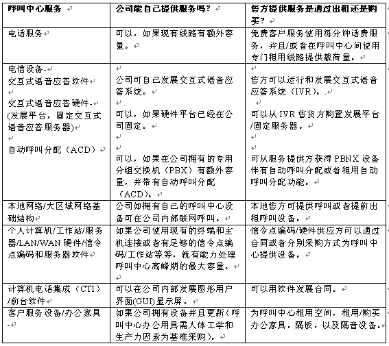 。。一旦決定從事呼叫中心業(yè)務(wù),公司必須確定要從外部售貨方購買的服務(wù)與設(shè)備的范圍。公司政策和經(jīng)營法則會(huì)指示其應(yīng)遵循什么程序進(jìn)行這一過程。也可能會(huì)是一些合同,它們可以使公司能夠快速地完成這些步驟。