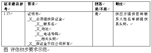 。。在評(píng)估的這一部分中通常不給予建議申請的"初步強(qiáng)制性要求"。但是,若不提供基本要求的信息,可能造成停止對某一特定建議評(píng)估。圖x中的示范工作表用來檢驗(yàn)供應(yīng)方對這些初步要求的回應(yīng)。