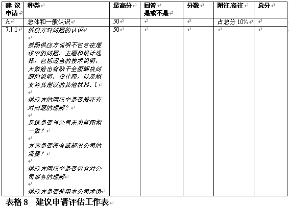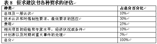 。。在決定了初步要求之后,評(píng)估小組應(yīng)具體地開展評(píng)估工作。具體評(píng)估的目標(biāo)是通過給建議書主要方面打分作出評(píng)估?梢栽谒愠鼋ㄗh書各方面占總分?jǐn)?shù)的百分比,如表8中對各方面的總覽。一般在建議書內(nèi)向提供者給出這一信息。