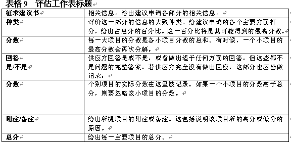 建議申請?jiān)u估工作表有助于資源選擇工作組客觀地對承包商建議進(jìn)行評(píng)價(jià)。這一過程包括在總分基礎(chǔ)上給各個(gè)方面評(píng)分。表格8舉出了一個(gè)具體的評(píng)分表表格9包含了對工作表標(biāo)題的解說。