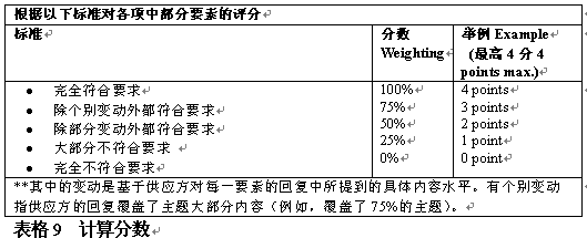 。。評(píng)分者應(yīng)該了解供應(yīng)方對所提建議申請的回復(fù),從各方面評(píng)估該建議符合每一評(píng)判標(biāo)準(zhǔn)的情況,相應(yīng)地給出分?jǐn)?shù)。根據(jù)每個(gè)標(biāo)準(zhǔn),應(yīng)在評(píng)判過程中分組給出最高分?jǐn)?shù)。表格9舉例說明了如何對回復(fù)打分。.