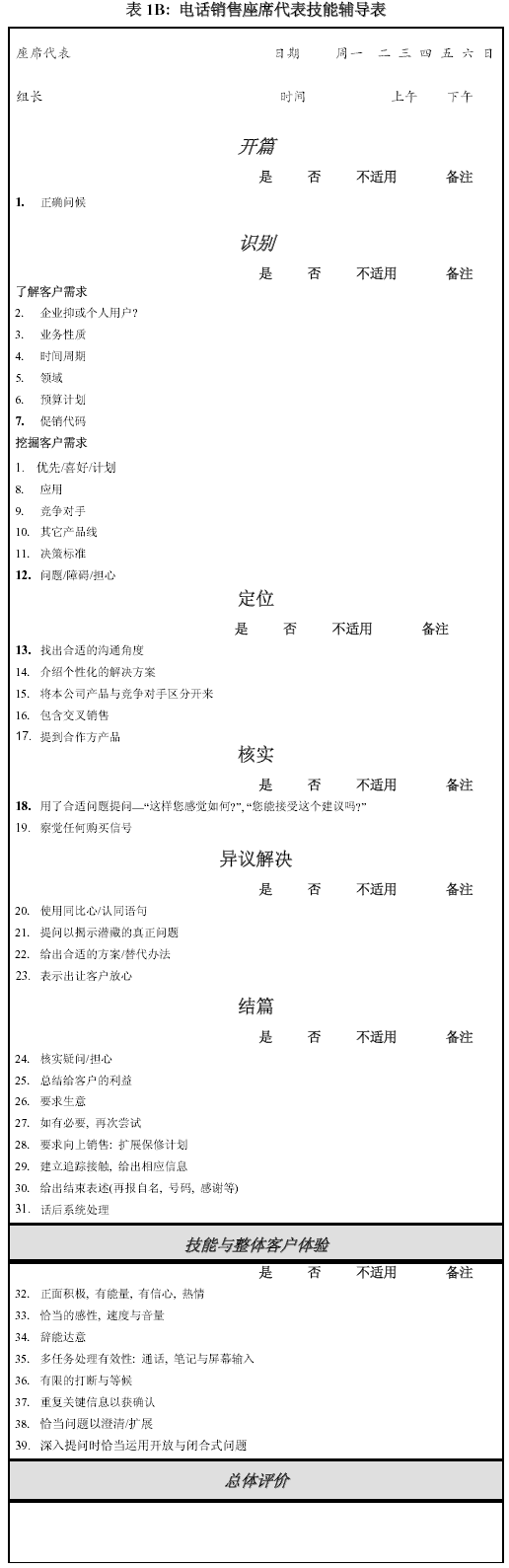 。。以上表格很顯然強(qiáng)調(diào)的是電話銷售的整個(gè)完整過程. 通話的態(tài)度與技巧則放在最后通盤考量.