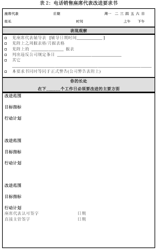 。。這里所列的兩張輔導(dǎo)表應(yīng)該是主管、質(zhì)檢與輔導(dǎo)師最常見的工具。那種無法對通話內(nèi)容進(jìn)行具體、詳盡分析,或者輔導(dǎo)人自己也定義不清, 不能給出示范與明確改進(jìn)方向的管理絕對不是專業(yè)的管理。在這類輔導(dǎo)表之外,可以根據(jù)通話的評價(jià)和其它一些紀(jì)律觀察,設(shè)計(jì)一種“改進(jìn)要求表”,將根據(jù)表現(xiàn)觀察后制定的改進(jìn)要求詳細(xì)列出。如果公司有書面警告一類的程序要求,也可揉合進(jìn)改進(jìn)要求書。