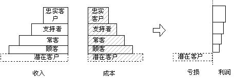 科特勒根據(jù)客戶的忠誠度給了我們一個(gè)階梯,這是客戶關(guān)系管理工作的良好參照,同時(shí)也可作為客戶關(guān)系管理工作考核的工具。我們將這個(gè)階梯做如下改造:每個(gè)層次的寬度是此級次客戶的數(shù)量,每個(gè)層次的高度是此級次客戶給企業(yè)帶來的收入,我們可以得到一個(gè)企業(yè)收入客戶分布結(jié)構(gòu)圖,如右圖所示: 從圖中可以很清楚的看出客戶管理工作的內(nèi)容:層次寬度(每個(gè)層次客戶的數(shù)量)和層次的高度(每個(gè)層次客戶的平均贏利水平)。 |