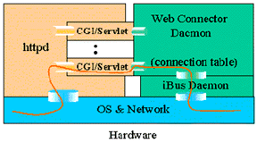 所有來自客戶端的請求(瀏覽器和Applet)都首先發(fā)送給Web Server(HTTP Daemon),然后由httpd啟動相應(yīng)的CGI/servlet擴展,CGI/servlet模塊僅對上傳的數(shù)據(jù)進(jìn)行簡單的檢查和打包工作然后就傳給Web Connector Daemon,CGI/servlet模塊本身并不處理連接,它是以一種無連接的方式轉(zhuǎn)發(fā)一個請求再回送應(yīng)答。連接的維持和記錄由Web Connector Daemon建立起連接記錄表來完成。