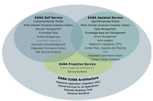 KANA的客服解決方案就是答案——KANA提供第一流的互聯網架構的服務解決方案,支持自助服務(Self Service),主動服務(Proactive Service)和幫助服務(Assisted Service),綜合呼叫管理,電腦電話整合技術,并整合了知識管理和知識倉庫,案例管理和綜合分析功能。