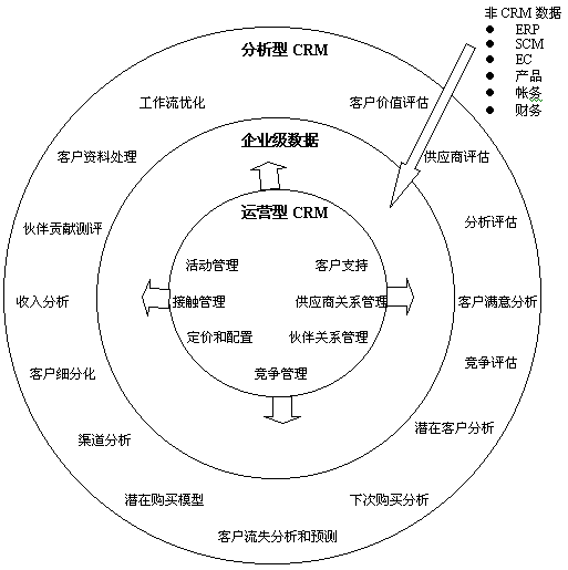 能提供上述問題和其他企業(yè)問題的客戶信息,就能夠?qū)蛻舴⻊?wù)、銷售技巧和隨后的促銷戰(zhàn)略作出關(guān)鍵決策。通過對“運營型”CRM數(shù)據(jù)與來自于全公司的信息進行集成,公司便能夠開始執(zhí)行分析型CRM;并且執(zhí)行后,可以作出真正的“以客戶為中心”的企業(yè)決策。