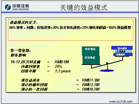 華夏證券經(jīng)紀(jì)業(yè)務(wù)總部的姚磊作為唯一的成功應(yīng)用案例代表,主要是和與會的金融機(jī)構(gòu)分享在客戶關(guān)系管理規(guī)劃方面的一些成功經(jīng)驗(yàn)。華夏證券認(rèn)為,對于證券公司的經(jīng)紀(jì)業(yè)務(wù)來講,客戶關(guān)系管理的主要目標(biāo)應(yīng)該是把客戶關(guān)系管理系統(tǒng)的核心功能融入開戶、交易、服務(wù)、咨詢等四個與客戶互動的過程之中,比如:客戶資料規(guī)戶整合形成統(tǒng)一的客戶號,管理客戶交易偏好和產(chǎn)品偏好上的變化,配合多種渠道建立一對一銷售流程,客戶終身價值管理。在風(fēng)險控制方面,華夏證券同樣貢獻(xiàn)了寶貴的經(jīng)驗(yàn),在這方面他們認(rèn)為最重要的方面是要做好高層領(lǐng)導(dǎo)的灌輸和培訓(xùn)工作,讓企業(yè)的高層領(lǐng)導(dǎo)對于客戶關(guān)系管理有一個正確的理解,從而對于項目的投資有一個合理的預(yù)期和實(shí)證,通俗一點(diǎn)說,就是首先為整個項目找一個合適的發(fā)起人。第二點(diǎn)要注意,要有專業(yè)的項目管理隊伍,這其實(shí)就是集成商選擇方面的風(fēng)險。除此之外,還要對項目要有一個明確的定義,關(guān)注每一步提交的結(jié)果,在項目過程中就隨時發(fā)現(xiàn)問題、解決問題。
