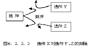 選件的排除關(guān)系是指在產(chǎn)品配置時,選擇了一件就不能選擇另外一件或多件。比如在旅行社在組團(tuán)時規(guī)定,如選擇了酒店A,就無法選擇組件交通工具中的選件火車,因?yàn)榫频闍離火車站太遠(yuǎn)。圖6、2、2、2說明了這種關(guān)系。
