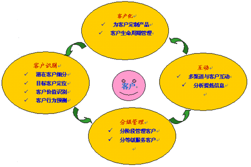 流程涉及到客戶生命周期管理、知識(shí)管理的流程。具體來(lái)說(shuō),流程涉及到兩大方面,其一,CRM成功實(shí)施后的企業(yè),應(yīng)該在業(yè)務(wù)流程上一個(gè)變革。企業(yè)各個(gè)部門(mén)開(kāi)展業(yè)務(wù)的共同前提是:以客戶為中心。其二,企業(yè)應(yīng)當(dāng)通過(guò)CRM來(lái)建立一種客戶管理的優(yōu)化流程,從客戶識(shí)別,到分級(jí)管理,再到企業(yè)與客戶互動(dòng),再到為客戶定制產(chǎn)品;然后循環(huán)往復(fù)。具體我們可以參見(jiàn)下圖:
