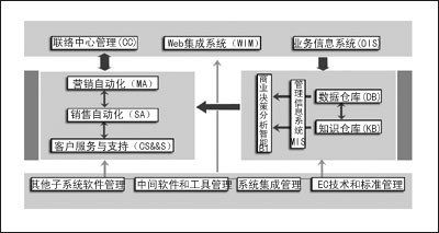 在信息技術(shù)管理子系統(tǒng)中,CRM的各功能模塊和相關(guān)系統(tǒng)運行都必須由先進的技術(shù)、設(shè)備、軟件來保障,主要的內(nèi)容可以分為以下四類:其他子系統(tǒng)應(yīng)用軟件管理,如數(shù)據(jù)庫管理系統(tǒng)、電子軟件分發(fā)系統(tǒng)等;中間軟件和系統(tǒng)工具的管理,如中間軟件系統(tǒng)、系統(tǒng)執(zhí)行管理工具等;企業(yè)級系統(tǒng)的集成管理,如CRM與企業(yè)管理信息系統(tǒng)的集成,乃至整個的企業(yè)應(yīng)用集成方案,以實現(xiàn)將企業(yè)的CRM與ERP、SCM等系統(tǒng)緊密集成;電子商務(wù)技術(shù)和標(biāo)準(zhǔn)的管理,如Internet技術(shù)、EDI技術(shù)及標(biāo)準(zhǔn)、通信標(biāo)準(zhǔn)的管理等。為支持無線應(yīng)用,CRM技術(shù)管理子系統(tǒng)將提供與手機、PDA、智能家電等工具的通訊接口,采用J2EE或.NET技術(shù)平臺,以及在支持無線傳輸和無線LAN應(yīng)用等方面進行相應(yīng)的調(diào)整。