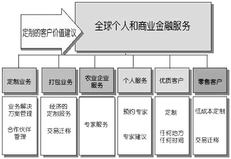 客戶細分方案 澳大利亞國民銀行定義了六個等級的客戶群,提供著不同程度的服務, 創(chuàng)建這些客戶等級的目的是讓銀行更容易地對客戶進行定義(如圖2所示)。