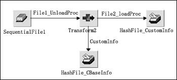 由于不同的源數(shù)據(jù)中可能包含同一個客戶的信息,因此采用Hashed File Stage HF_khjbxx存放輸出結(jié)果,相同客戶的信息根據(jù)客戶編碼覆蓋前面產(chǎn)生的信息,避免了重復(fù)的客戶信息。從不同源數(shù)據(jù)庫取得客戶信息,根據(jù)數(shù)據(jù)的真實性依次進(jìn)行處理后,生成的客戶信息全部保存在一個Hash文件中,最后從Hash文件中取出結(jié)果數(shù)據(jù)裝載到目標(biāo)數(shù)據(jù)庫中。