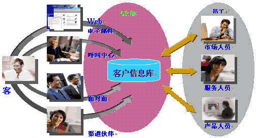 CRM是在90年代,隨著Internet的發(fā)展成熟起來。它充分利用了Internet技術(shù),通過電話中心、網(wǎng)站、電子郵件、移動(dòng)技術(shù)的使用,提供客戶多種形式的渠道,完成銷售、服務(wù)、市場(chǎng)等多種職能和流程,滿足客戶不同種類、不同層次的需求。這些渠道全方位地收集客戶信息,并通過集中的數(shù)據(jù)庫(kù)進(jìn)行管理和共享。而數(shù)據(jù)挖掘技術(shù)幫助企業(yè)進(jìn)一步分析客戶需求,提供決策支持。如下圖(資料來源:Siebel公司)。