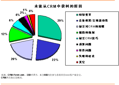 但成功只會(huì)擁抱那些能夠“正確執(zhí)行”的人,而不是任何一個(gè)搭上CRM順風(fēng)船的企業(yè)。2001年7月,CRM-Forum.com出版了一份關(guān)于未能從CRM中獲利原因的報(bào)告。從搜集到的來(lái)自CRM開(kāi)拓者的約900個(gè)回應(yīng)來(lái)看——客戶端企業(yè),CRM供應(yīng)商以及顧問(wèn),組織變革及企業(yè)政策/主觀能動(dòng)性占了50%以上的失敗原因;緊隨其后的各個(gè)因素包括缺乏對(duì)CRM的理解(20%)和糟糕的規(guī)劃(12%)。下面讓我們就CRM方法論的選擇對(duì)這些因素作一番考察吧。