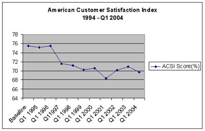 再看美國(guó)客戶滿意度指數(shù)(ACSI)的統(tǒng)計(jì),顯示客戶滿意度正在逐步下跌,考慮到這一點(diǎn),很明顯可以看出人們正越來(lái)越脫離客戶的本質(zhì)。