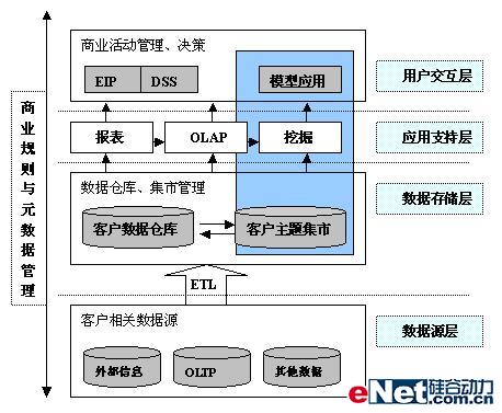 從上面的分析型CRM體系結構圖可以看出,整個架構分為數(shù)據(jù)源層、數(shù)據(jù)存儲層、應用支持層和用戶交互層總共四層。數(shù)據(jù)源層包括了企業(yè)常用信息系統(tǒng)和一些外部系統(tǒng)的數(shù)據(jù)源,比如涉及到客戶交互的一些交易系統(tǒng),服務系統(tǒng),各系統(tǒng)間的客戶數(shù)據(jù)是分散的,而且可能重合,出現(xiàn)不一致的問題;數(shù)據(jù)存儲層是為了整個企業(yè)有集中統(tǒng)一的客戶視圖,通過從各源系統(tǒng)抽取數(shù)據(jù),進行整合后的數(shù)據(jù)倉庫,而且在客戶數(shù)據(jù)倉庫的基礎上,可以建立相關分析之用的客戶主題數(shù)據(jù)集市;應用支持層除了支持復雜,智能化報表查詢外,還支持OLAP分析,提供數(shù)據(jù)挖掘功能;用戶交互層提供分析和挖掘結果同企業(yè)管理、決策層和企業(yè)其它服務人員和客戶的交互,形成反饋機制,從而有效地利用分析和挖掘得到的有用知識。