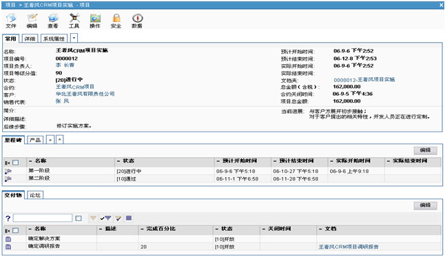 VamCRM提供專業(yè)的項目管理模塊,支持項目范圍管理、時間管理、資源管理、質(zhì)量管理、成本管理。支持以銷售合約為驅(qū)動、過程清晰、全程受控的項目管理方式為客戶交付產(chǎn)品和服務(wù)。VamCRM融入成熟的項目管理方法和成功的實(shí)踐經(jīng)驗(yàn),從整體上對項目進(jìn)行規(guī)劃、組織、執(zhí)行、控制,使企業(yè)可以更加優(yōu)質(zhì)地為客戶提供長期的服務(wù)。項目創(chuàng)建后,VamCRM系統(tǒng)會自動生成一個與當(dāng)前項目相匹配的文件夾,為項目執(zhí)行過程中產(chǎn)生的交付物或項目的有關(guān)文檔提供統(tǒng)一的存檔位置;項目全程融合項目管理的方法,分里程碑管理項目活動和交付物,實(shí)時統(tǒng)計項目的關(guān)鍵數(shù)據(jù),并且里程碑及所屬活動和交付物等都可分狀態(tài)量化標(biāo)識,對項目進(jìn)展做到實(shí)時監(jiān)控,避免了在項目實(shí)施中的“救火”行動和盲目發(fā)展。也可自動關(guān)聯(lián)記錄并統(tǒng)計所有項目進(jìn)展過程中發(fā)生的預(yù)算與費(fèi)用,實(shí)現(xiàn)項目費(fèi)用清晰可控。伴隨著項目的進(jìn)程,可以記錄所有在項目執(zhí)行過程中相關(guān)的聯(lián)系人、文檔、備忘錄等數(shù)據(jù),形成完整的項目內(nèi)容集合。項目中還包括基于項目的論壇,供項目組成員就項目的相關(guān)問題進(jìn)行在線交流,同時,項目管理全程與企業(yè)高效協(xié)同的業(yè)務(wù)流程無縫集成,能夠使企業(yè)的相關(guān)部門以項目為導(dǎo)向,集中所有資源高效協(xié)同服務(wù),大大降低項目執(zhí)行風(fēng)險。