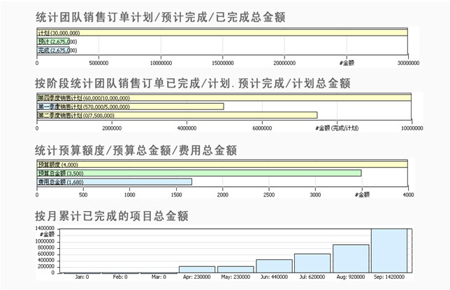 在VamCRM項目組合管理中集成項目數(shù)據(jù)的統(tǒng)計與分析,可以直接監(jiān)控項目計劃、預(yù)計及完成的項目數(shù)量、總金額和費(fèi)用的統(tǒng)計,也可按月累計已完成的項目數(shù)量、總金額和費(fèi)用,直接衡量項目實(shí)施的結(jié)果與效益。在費(fèi)用管理模塊中集成費(fèi)用數(shù)據(jù)的統(tǒng)計與分析,對于所有費(fèi)用可以按人及費(fèi)用類型進(jìn)行統(tǒng)計,實(shí)時知道哪一個人或哪一類費(fèi)用開銷最多,以及費(fèi)用與預(yù)算的對比分析。