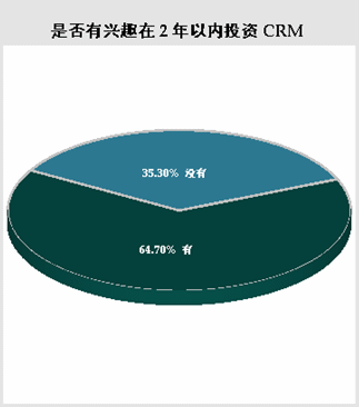在選擇“尚未使用任一CRM軟件”的被調(diào)查者中,當(dāng)被問(wèn)及基于現(xiàn)在的狀況,“是否有興趣在兩年以內(nèi)投資CRM”。有64.70%的被調(diào)查者選擇有興趣在兩年內(nèi)投資CRM軟件,而選擇沒有興趣在兩年內(nèi)投資CRM軟件的只占35.30%。盡管現(xiàn)在實(shí)際使用CRM軟件的用戶所占比例還不甚理想,但市場(chǎng)前景還是非?春茫蟛糠止揪哂袑(shí)施CRM軟件的需求。