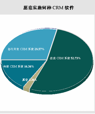 CRM軟件,或在線CRM軟件”;也有28.57%的被調(diào)查者選擇自行開發(fā)CRM軟件;相比于前面兩種類型,被調(diào)查者對(duì)傳統(tǒng)CRM軟件的需求則處于一個(gè)較低的水平,有16.36%的被調(diào)查者仍然選擇有興趣在兩年投資傳統(tǒng)的CRM軟件。雖然ASP的模式在中國(guó)市場(chǎng)上的認(rèn)知度仍然有限,但是市場(chǎng)對(duì)on-demand