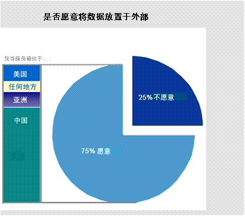在所有被調(diào)查者中,明確表示不愿意將數(shù)據(jù)放置于托管服務器比例相對較低,只有25%的被調(diào)查者認為他們不愿意將公司數(shù)據(jù)放置于外部托管服務器。