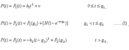 式中,P(t)為客戶第t個時間單元的客戶利潤。P1(t)為一二次增函數(shù),表示客戶利潤以一定的加速度(2h1)快速增加;P2(t)為一上漸近線函數(shù),表示客戶利潤一直增長但增長越來越慢,且始終越不過一個利潤最高限,最高限為(P1(g1)+N);P3(t)為一個二次降函數(shù),表示客戶利潤以一定的加速度(2h2)銳減。參數(shù)v、h1、h2、g1、g2、N都是正常數(shù)。v是客戶第一次購買帶給公司的利潤,通常這個值不高,甚至接近0(不考慮獲取成本,否則v常為負(fù)值)。h1、h2反映了客戶利潤增長和下降的加速度。g1、g2是利潤曲線發(fā)生轉(zhuǎn)折的兩個時點(diǎn)。N是g1時點(diǎn)后利潤總增幅的極限。