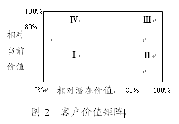 (二)確定客戶當(dāng)前相對價值和客戶相對潛在價值通過預(yù)測,識別出了客戶當(dāng)前價值CCV和增值潛力CPV。但是,這兩個維度指標(biāo),均以絕對價值形式出現(xiàn)對客戶進(jìn)行細(xì)分并不理想(張國方,金國棟,2003(3)),在一定程度上會影響到理論應(yīng)用的方便性(簡便性)。因此,可以采用更加明了和更具有實(shí)踐操作性的維度指標(biāo)——客戶當(dāng)前相對價值和客戶相對潛在價值!翱蛻舻南鄬Ξ(dāng)前價值”是指某一客戶提供的當(dāng)前價值與企業(yè)未來可望實(shí)現(xiàn)的當(dāng)前價值總額的比值;而“客戶的相對潛在價值”是某一客戶提供的增值價值與企業(yè)未來可望實(shí)現(xiàn)的全部最大增值價值的比值。